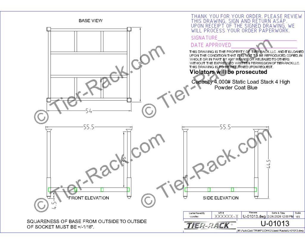 U-01013 U-01013-MS Item: U-01013Outside Dimensions: 54”L x 48“WClear Height: 36” (usable space)Capacity: 4,000 lbsStack Height: 4Color: BlueFull Rack Sets