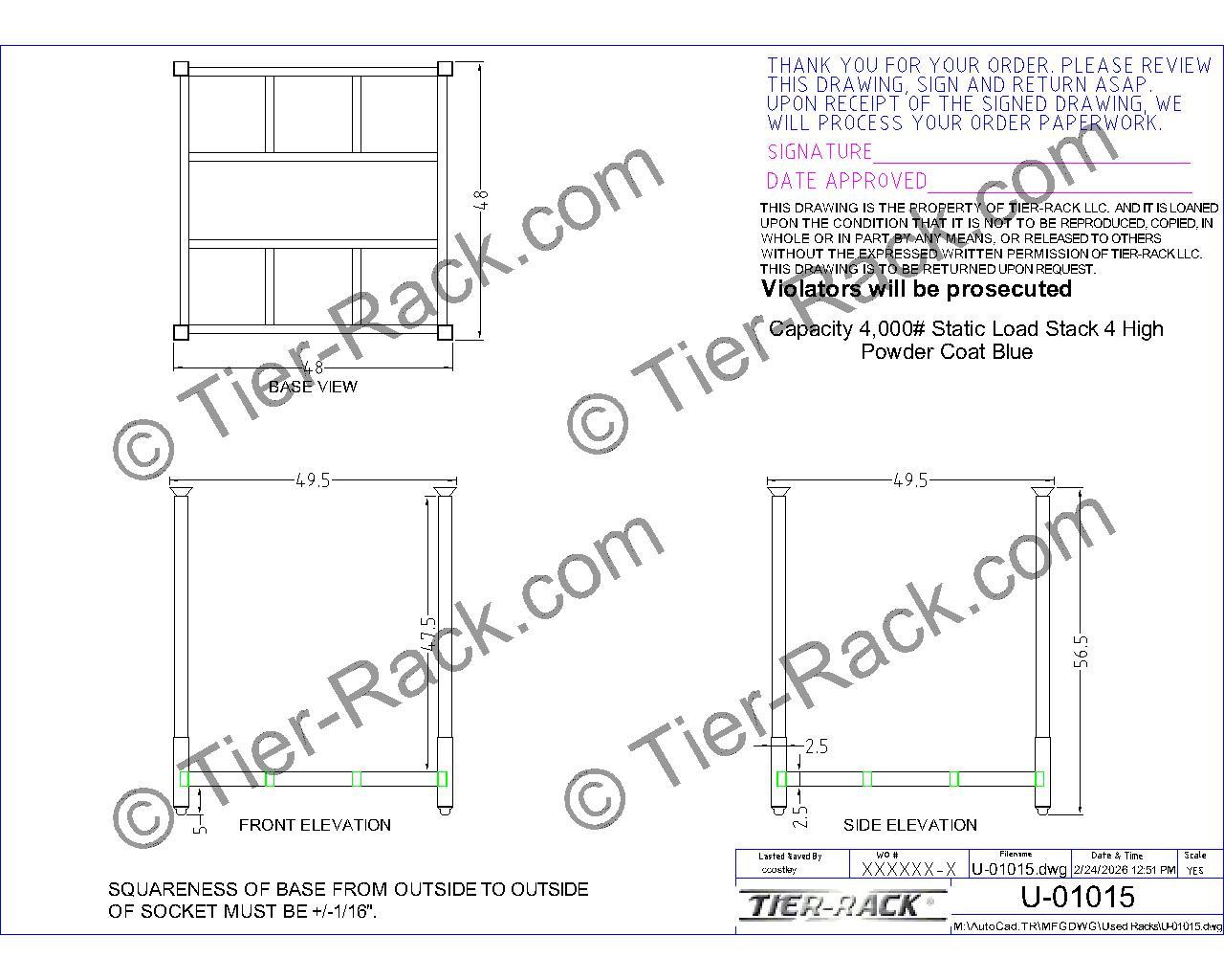 U-01015 U-01015-MS Item: U-01015Outside Dimensions: 48”L x 48“WClear Height: 47.5” (usable space)Capacity: 2,500 lbsStack Height: 4Color: BlueFull Rack Sets